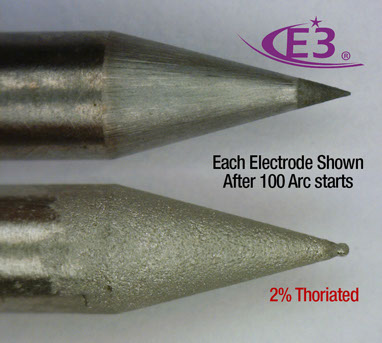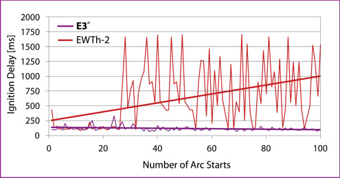 Testing has shown that ignition delay with E3® is actually improved over time while thoriated tungsten starts to deteriorate after only 25 starts.