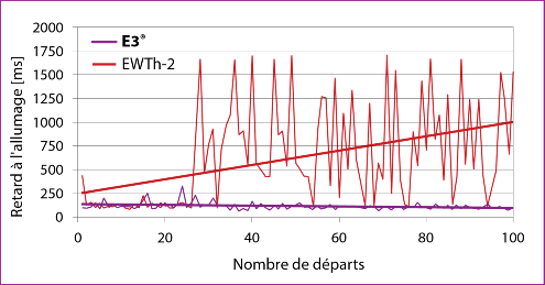 Aux essais, le délai d’allumage des électrodes de tungstène E3® s’est amélioré au fil des amorçages, alors que celui des électrodes de tungstène thorié s’est détérioré après seulement 25 amorçages.