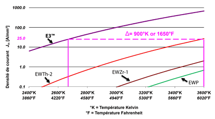 1650 °F (889 °C) de moins que l’électrode de tungstène thorié à la même intensité de