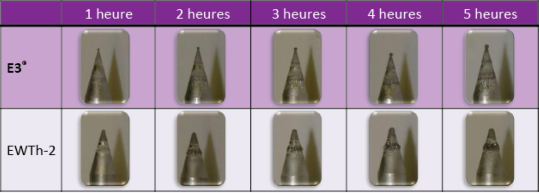 Lors d’essais, la géométrie de la pointe de l’électrode E3® est restée stable, donc plus durable que l’électrode thoriée.